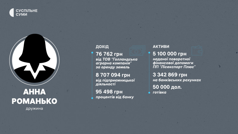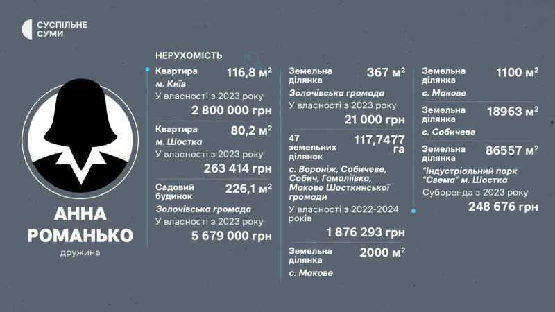 Показав у декларації і власність дружини Анни Романько. Зокрема, 47 земельних ділянок у Воронежі, Собичевому, Собичі, Гамаліївці та Маковому Шосткинського району (загальна площа майже 118117,7477 га га, сумарна вартість вказана майже 1,91 876 293 грн млн грн). У жінки вони з'явилися з 2022 по 2024 роки. Частину орендують ПП "Вікторія" та ТОВ "Голландська аграрна компанія". А сама Анна з 2023 на правах суборенди користується понад 8,5 га комунальної землі у Шостці. Цю ділянку орендує "Індустріальний парк "Свема".