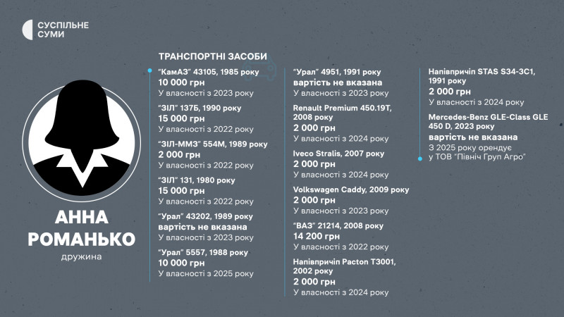 Свої преміальні позашляховики, згідно з декларацією, подружжя орендує. Олексій Романько з 2024 року користується Toyota Land Cruiser Prado 2022. Авто належить ПП "Лісекспорт Плюс". Вартість вказана 1,2 млн грн. Анна Романько їздить з 2025 року на Mercedes-Benz. GLE 450 D 2023, який орендує у ТОВ "Північ Груп Агро". Вартість не вказана. На авторинку ціна стартує від 2,9 млн грн.