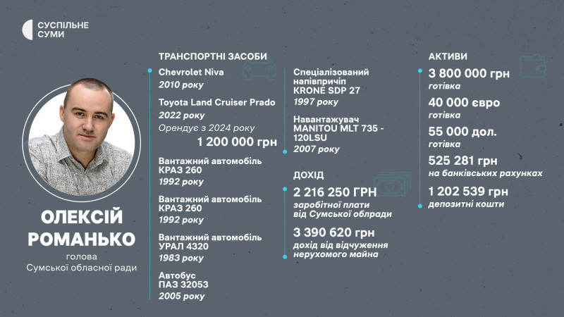 У Олексія Романька три вантажних авто, автобус, навантажувач, напівпричіп та Chevrolet Niva 2010. Їхню вартість не вказував, придбав до повномасштабного вторгнення.