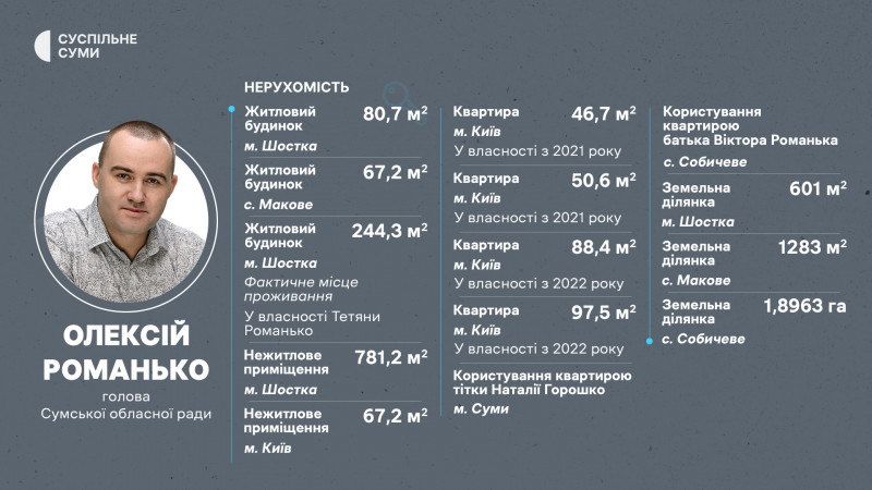 У Сумській обласній раді Романько отримав понад 2,2 2216 250 млн грн заробітної плати. Ще майже 3,43 390 620 млн грн — дохід від продажу нерухомості Едуарду Заїці. Майже 172171 916 тис. грн — проценти від "Універсал Банку".