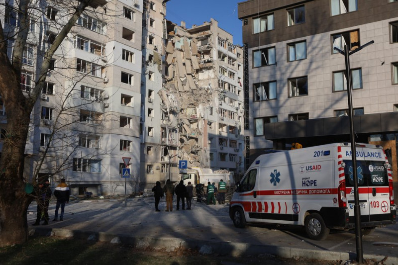 Рятувальники, комунальники, медики біля багатоповерхівки у Херсоні, в яку влучила російська керована авіабомба, 20 лютого 2025 року. Суспільне Херсон/Олександр Корняков