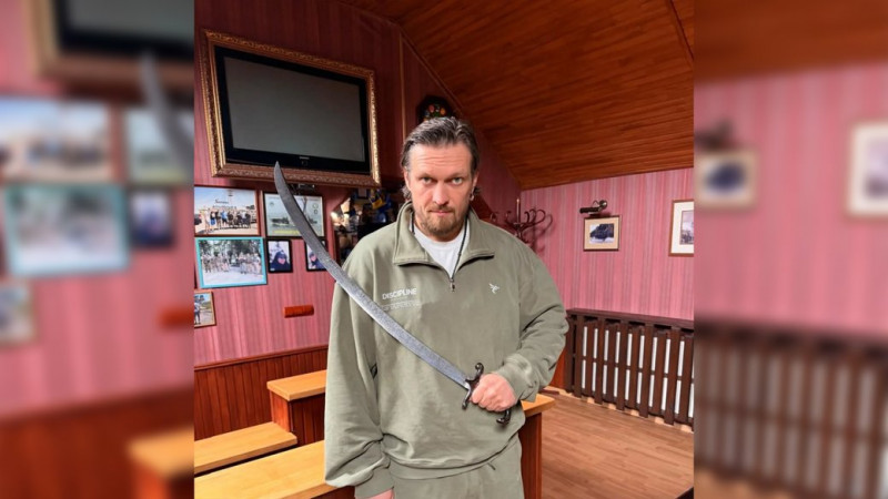 Олександр Усик з клинком, який для нього виготовив Денис Мостович з Чернігівщини. Денис Мостович