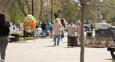 У сквері в центрі Черкас під час повітряної тривоги хтось робить фото, хтось гуляє, а хтось відпочиває на лавці: сирени тривоги для області пролунали двадцять хвилин тому через загрозу балістики.