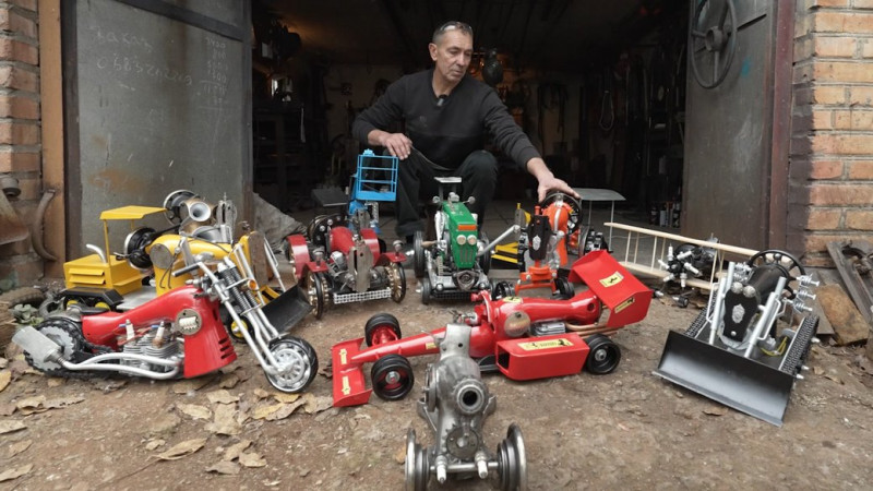 Літаки, автомобілі для перегонів, мотоцикли, трактори та гармати — мініатюрну техніку зі старих швейних машинок, які купує на металобрухті, виготовляє майстер зі Здовбиці на Рівненщині Євгеній Сак. Слюсар за фахом, він зараз ремонтує вантажівки для військових, а у вільний час — творить. Захоплення з’явилося приблизно рік тому завдяки дітям, відтоді його доробок налічує 12 екземплярів.