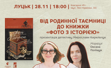28 листопада у Луцьку у книгарні «Є» ( вул. Лесі Українки, 30) відбудеться презентація детективу Мирослави Кирильчук «Фото з історією, або Загадка вояка УПА». Захід розпочнеться о 18 годині. Розмову модеруватиме Оксана Поліщук.