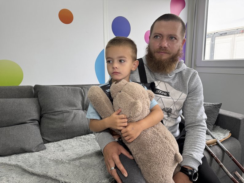 Мешканець модульного містечка Дмитро Кондратенко з сином Віктором. Суспільне Полтава