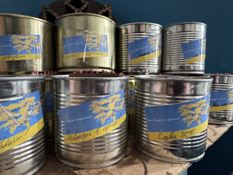 Ольга Легка займається підготовкою бляшанок і гнотів. За її словами, процес уже відпрацьований до автоматизму.