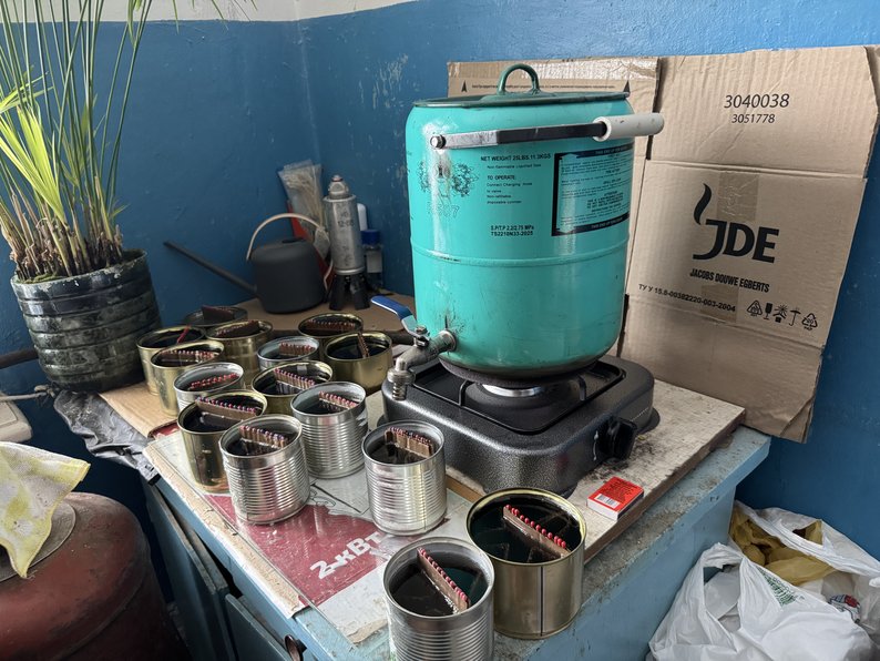 У окопні свічки Іван Легкий міксує декілька компонентів. Це, зокрема, парафін, стеарин, віск, залишки церковних свічок. Через це свічки довше горять.