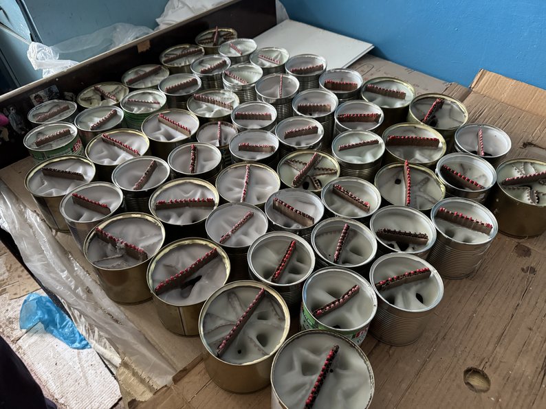 В одній із кімнат будинку — мішки та пакети з металевими бляшанками. Їх очищають від етикеток, вирівнюють, а згодом використовують для виготовлення окопних свічок.