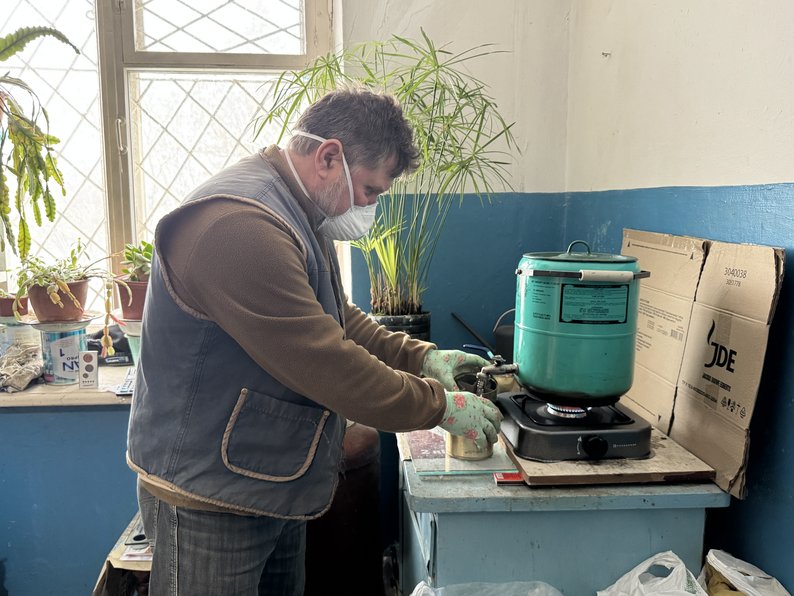 У окопні свічки Іван Легкий міксує парафін, стеарин, віск, залишки церковних свічок. Суспільне Полтава
