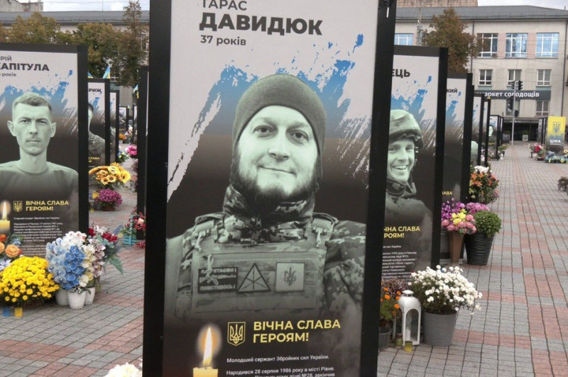 Портрет Тараса Давидюка в інсталяції “Ціна Незалежності” у центрі Рівного, 7 жовтня 2025 року.