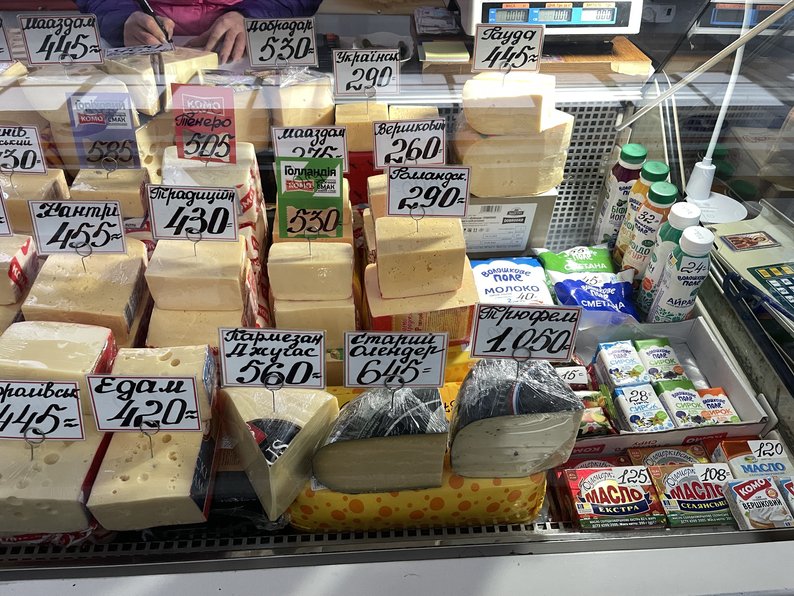 "Є тверді сири українського виробника, є м’які – адигейський і сулугуні, бринза українського виробника і також імпортні Голландія і Польща. Крім сирів, є масло, сметана, кисломолочний сир, ряжанка, кефір, сирки глазуровані, йогурти. Деякі виробники попіднімали товар (ціну – ред.), тому що вони варять сир завдяки генератору, це додаткові витрати. На 25 гривень ось цей сир піднявся, сулугуні піднявся на 20 гривень", — розповіла продавчиня Юлія Музика.