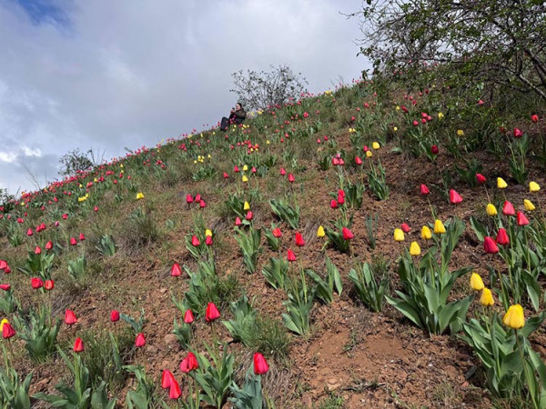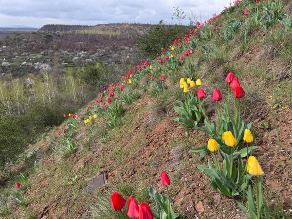 Впродовж 10 років на схилі промислового відвалу у Кривому розі висаджує восени тюльпани місцевий гід Володимир Огур. Нині на крутому схилі розцвіло близько 15 тисяч квітів. Про це розповідає Суспільне.