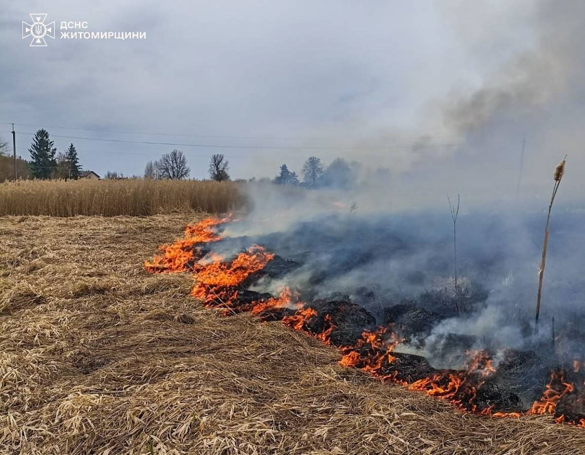 У селі Квітневе Житомирського району при в’їзді до населеного пункту, вогонь із сухої рослинності перекинувся на очерет. Рятувальникам вдалося оперативно загасити пожежу та не допустити її поширення на житлові будинки.