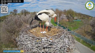 Кладка яєць у гнізді лелеки Одарки відбувалася поступово протягом другої половини квітня 2026 року. Під час онлайн-спостереження зафіксували чіткий графік появи кожного яйця, найчастіше у вечірній або нічний час: