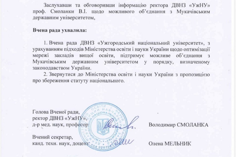 Вчена рада УжНУ заслухала й обговорила інформацію ректора вишу Володимира Смоланки щодо можливого об'єднання з МДУ. Члени ради підтримали рішення, а також звернулися до Міністерства освіти і науки України щодо збереження почесного статусу національного у разі такого об’єднання.