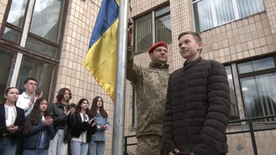 Оркестр 44-ої бригади виконав гімн України. Державний прапор підняв офіцер управління 44-ої артбригади Петро Федів та його син Володимиру, який вчиться у цій школі.
