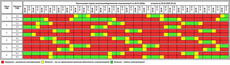 "Згідно вказівки НЕК "Укренерго" 2026-01-26 на території Тернопільської області діятиме Графік погодинних відключень. Графік протягом доби може змінюватися. Просимо слідкувати за оновленнями на нашому офіційному сайті", – написали на facebook-сторінці установи.