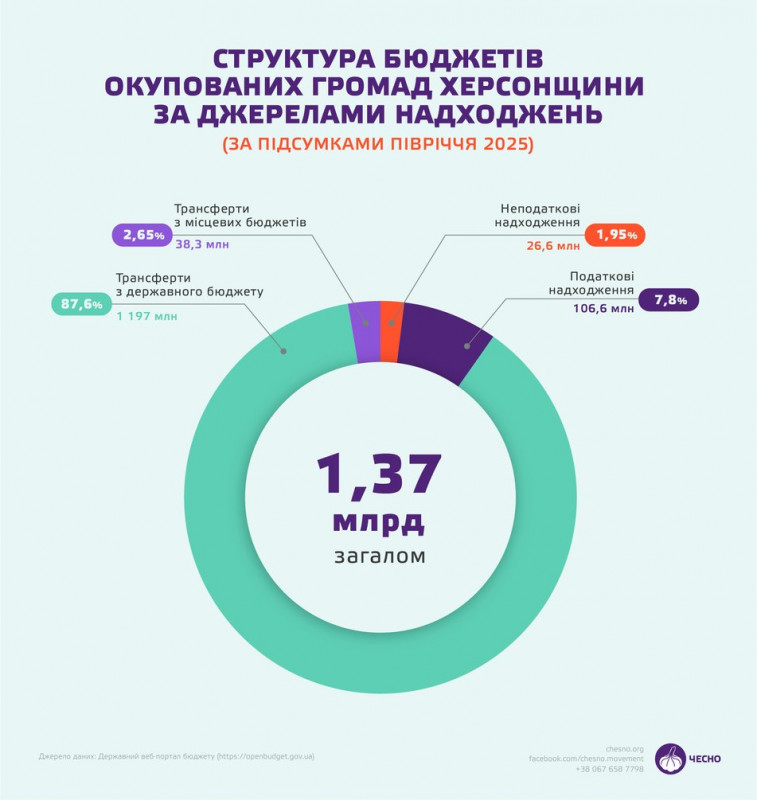За її словами, дослідження показало, що бюджети окупованих громад Херсонщини майже повністю залежать від грошей з державного бюджету — це близько 88% усіх надходжень. Ще є податки — приблизно 8%, неподаткові платежі — близько 2%, допомога від інших місцевих бюджетів — близько 2,6%.