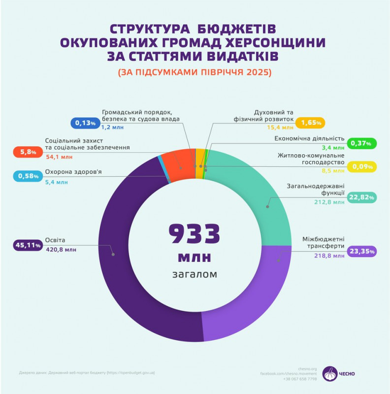 За даними ЧЕСНО, найбільше грошей у бюджетах окупованих громад Херсонщини за перші шість місяців 2025 року пішло на освіту — понад 45%. Це 421 млн грн.