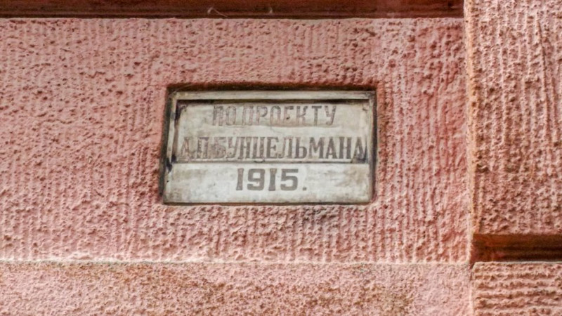Табличка на будівлі готелю у Херсоні з датою будівництва та ім’ям архітектора. Фото з архіву Сергія Дяченка