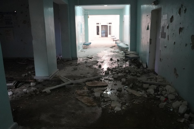 Цегла та уламки у коридорі медзакладу після російського обстрілу, лютий 2026 року. Суспільне Херсон
