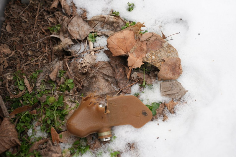 Розірвана міна-“пелюстка” лежить на дорозі в опалому листі та снігу, Херсон, лютий 2026 року. Суспільне Херсон