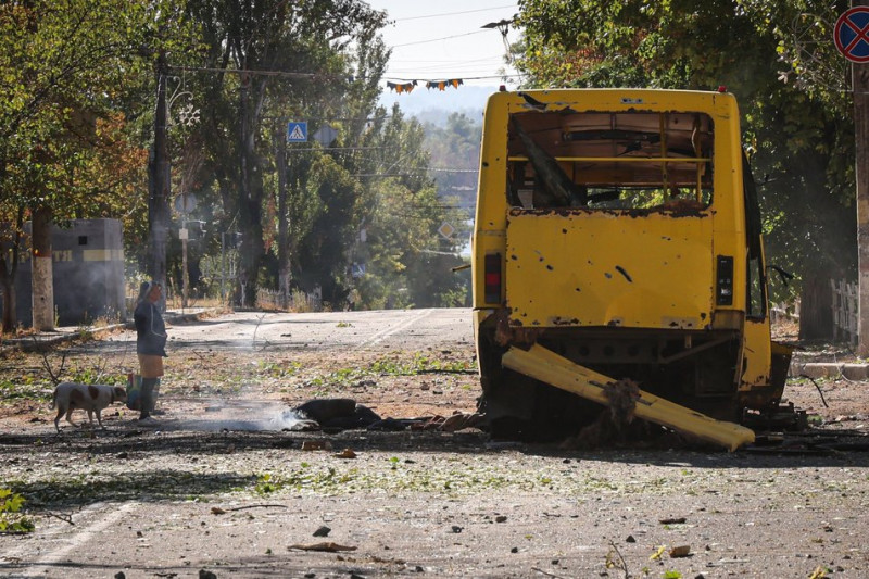 Жінка з собакою біля пошкодженої снарядами маршрутки після чергового обстрілу Херсона, вересень 2025 року. Суспільне Херсон/Олександр Корняков
