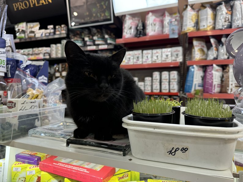 Через морози до магазину частіше приходять нові коти, говорить продавець зоотоварів Максим. Є і постійні мешканці.