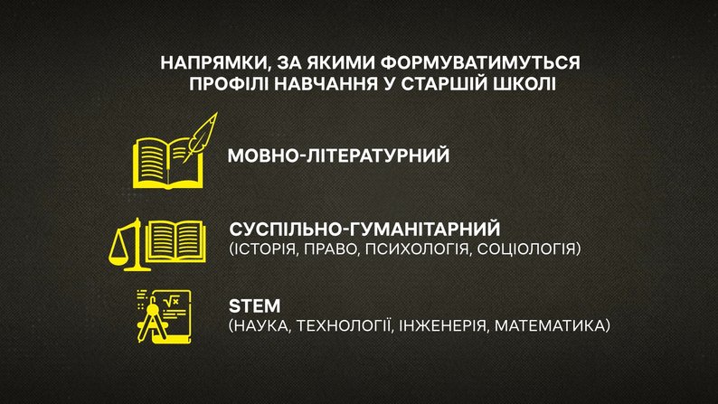 Старша школа матиме три напрямки, за якими формуватимуть профілі навчання: мовно-літературний, суспільно-гуманітарний, куди входитиме історія, право, психологія, соціологія та STEM, який об’єднає науку, технологію, інженерію та математику.
