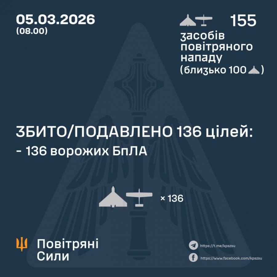 Как сообщили ВС ВСУ, в ночь на 5 марта оккупанты выпустили по Украине 155 ударных дронов разных типов, около сотни из них Shahed. Силы обороны задействовали авиацию, ПВО, РЭБ и мобильные группы. По предварительным данным, сбито или подавлено 136 вражеских БПЛА.