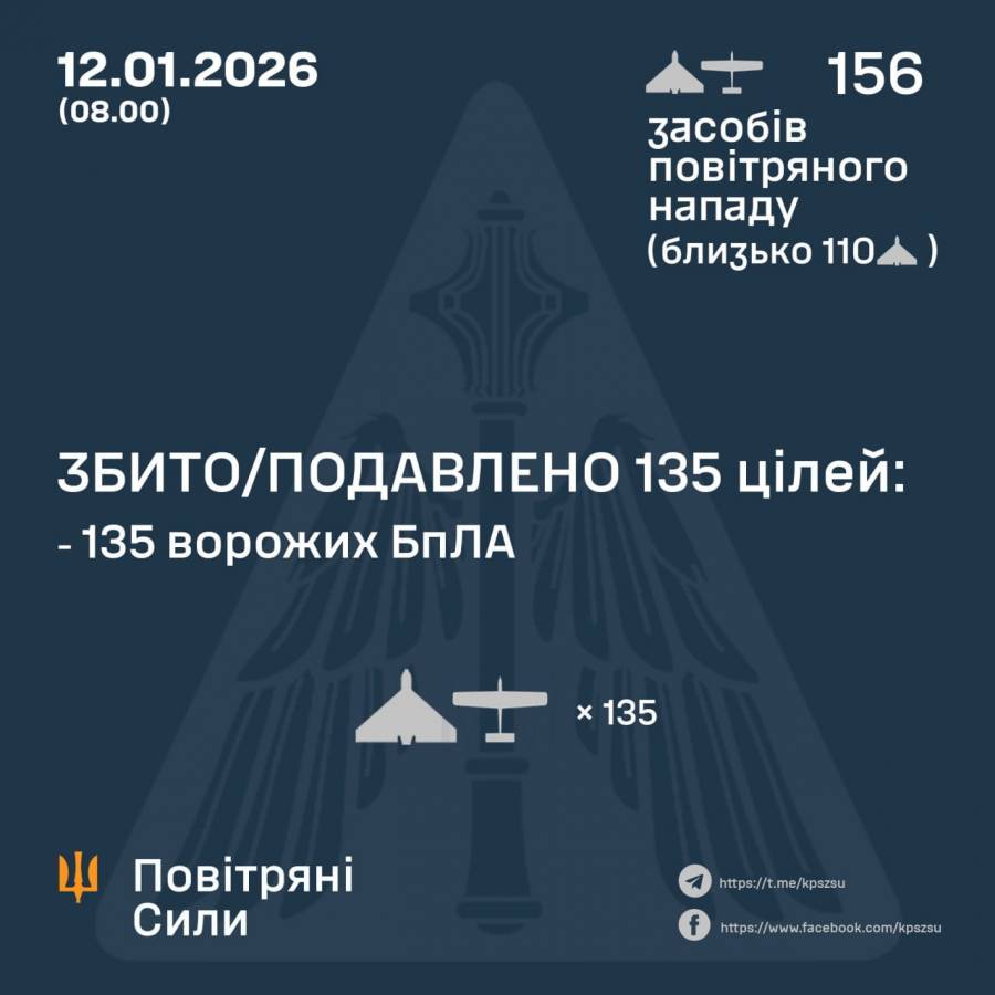 Российская военная агрессия против Украины не прекращается уже 1419-й день. В ночь на 12 января оккупанты выпустили 156 ударных беспилотников различных типов, преимущественно Shahed. По данным Воздушных сил, украинская ПВО сбила и подавила 135 дронов, однако есть попадания.