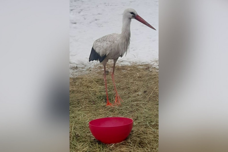 Жінка зауважила, що птах з'явився на сінокосі напередодні Нового року, 30 грудня. Вона впізнала його, бо навчилася відрізняти лелеку за пір'ям та кольором лап.