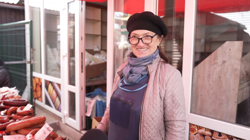 "Торгую від восьмої години. Вранці трохи товару продала. Найчастіше у мене купують шинку, бочок, ковбаску домашню, таку на освячення. Шинка – 420. Бочок – 350. Ковбаска — 350, 380. Є всяка".