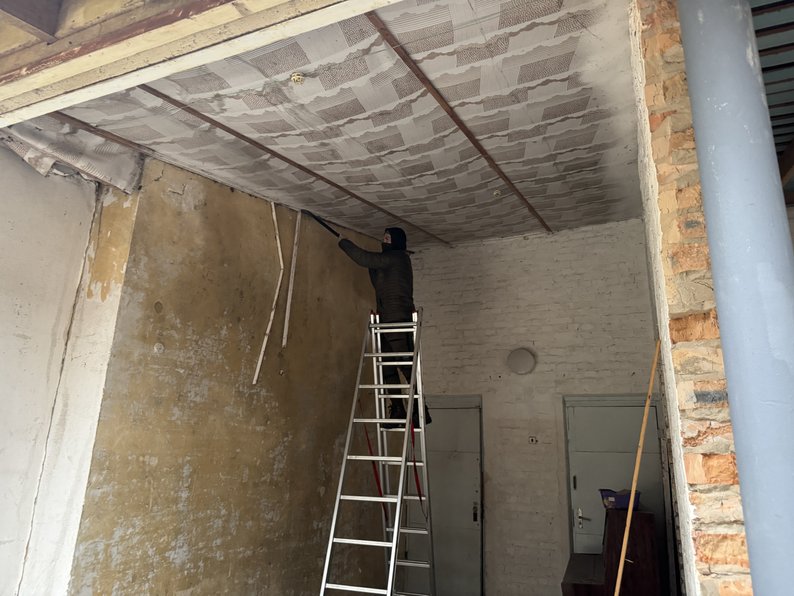 "Багато роботи, треба грунтувати, фарбувати. Вчора ми зачищали стіну, щоб також її пофарбувати, щоб вона була гарна. Спочатку ми тут прибирали, бо в приміщенні було багато речей. Отам у нас була стіна, її винесли. Повністю прибрали ту кімнату, познімали стару оббивку. Тут також була така метрова стіна і зверху вікна. Їх теж всі винесли і прибрали. Зробили вже дуже багато", — розповіла волонтерка Ірина Яковенко.