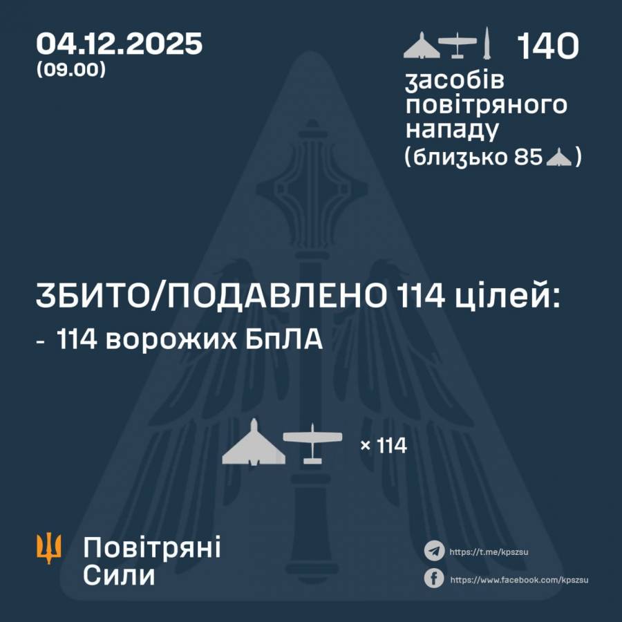 ВС ВСУ сообщили, что в ночь на 4 декабря армия РФ атаковала Украину двумя баллистическими ракетами “Искандер-М” и 138 ударными беспилотниками (из них около 85 — Shahed) .