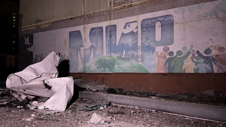 Також через удар "шахеда" пошкоджено стіну з написом "Мир".