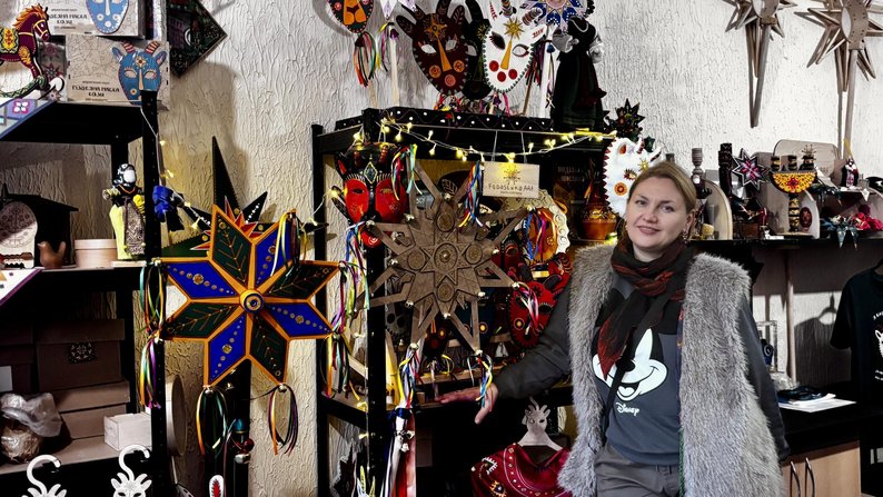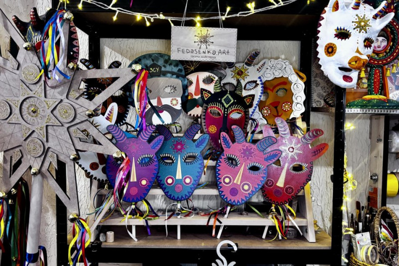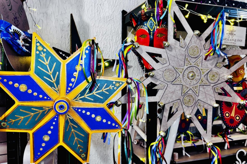 Майстриня Тетяна Федосенко виготовляє різдвяні зірки та маски кози для вертепу. З початком вторгнення вона переїхала з Києва у Мукачево і заснувала свій бренд сувенірної продукції в етностилі, місія якого — відновлення та популяризація українських традицій. Більше читайте в матеріалі Суспільного.