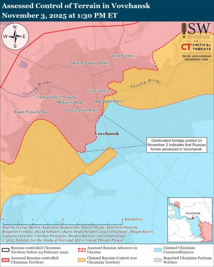 Дослідники Інституту вивчення війни, посилаючись на геолокаційні відеозаписи констатують, що війська РФ нещодавно просунулися в південній частині міста Вовчанськ. У російських пабліках повідомляють про просування у самому Вовчанську (до вулиці Пролетарська), та на флангах у Синельниковому та Тихому.
