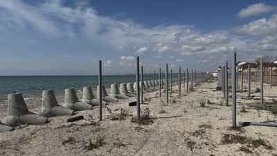 Ряд бетонних конструкцій на піщаному пляжі Коблевого. Суспільне Миколаїв/Олександр Гордієнко
