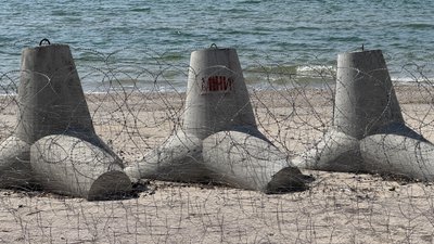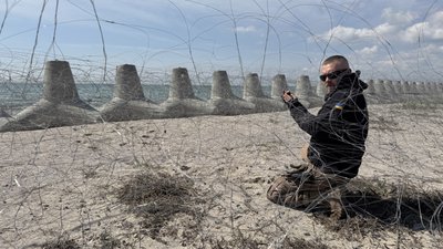 "Ми поєднуємо це з мінно-вибуховими загородженнями. У нас у воді стоять протитанкові та протидесантні мінні загородження. А також і в піску попереду тетраедрів — протипіхотні мінні загородження", — розповідає Хоменко.