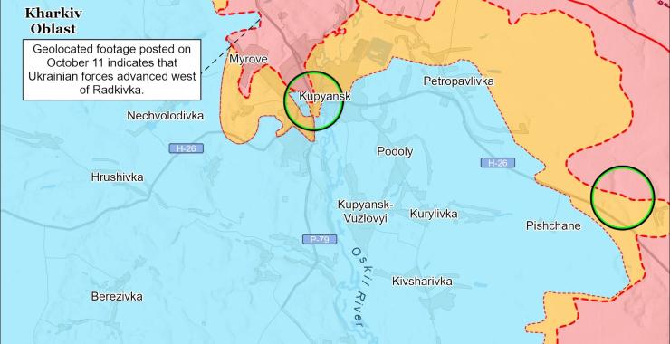 “Геолокаційні кадри, опубліковані 11 жовтня, свідчать про те, що українські війська нещодавно просунулися на захід від Радьківки (на північ від Куп’янська)… Російський військовий блогер заявив, що українські війська провели контрнаступ у Куп’янську”, — пише Інститут вивчення війни.