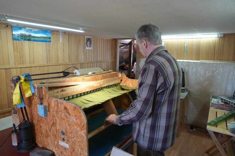 "Тут робляться основи для сіток. Кожна сітка має розмір 6 на 4 метри. Я виготовляю основу й передаю її вже готову тим, хто буде її плести", — пояснює Олег.