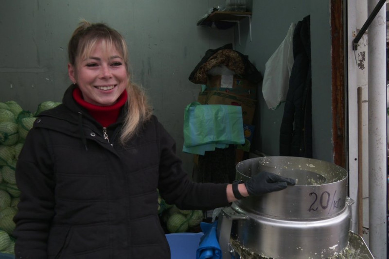 "Капусту кришимо нашу домашню, власного вирощування. У порівнянні з минулим роком ціна набагато менша. Тобто, людям цьогоріч її купити доступніше, ніж було минулого року. Наразі ми продаємо тільки кришену капусту. Вона з міста Радехів Львівської області", — розповіла продавчиня Марія.