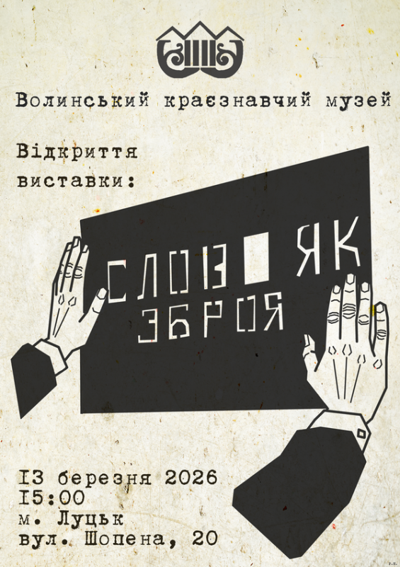 Усіх охочих запрошують на відкриття виставки «Слово як зброя», що відбудеться у Волинському краєзнавчому музеї 13 березня о 15:00. У день відкриття вхід вільний.