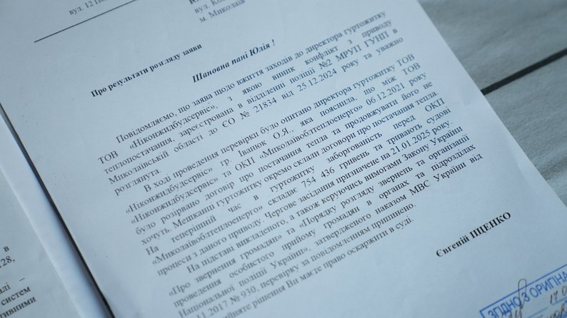 "На даний час температура у приміщенні в мене — чотири градуси, до п’яти не доходить. Доступ до лічильника та представників "Миколаївоблтеплоенерго" вони ("Ніконджитбудсервіс" — ред.) не допускають. На робочому місці вони також відсутні. Перебувають там лише тоді, коли потрібно видати рахунки на оплату", — розповідає Яна.