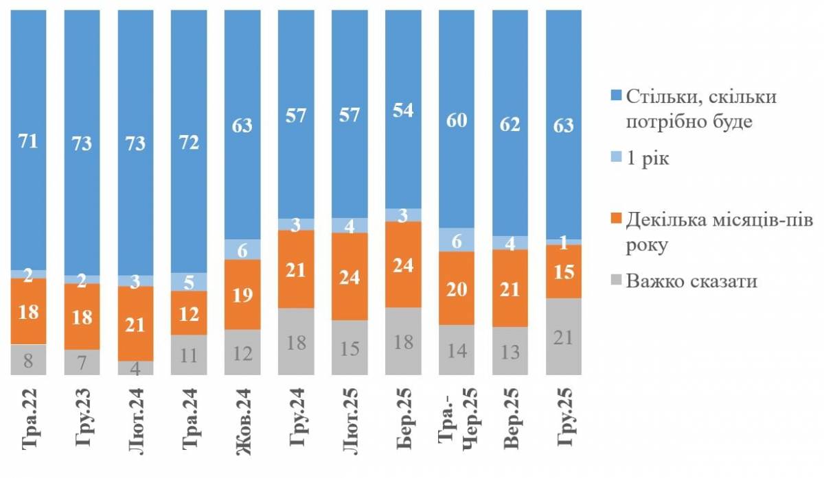 Результаты показывают, что 63% украинцев готовы терпеть войну столько, сколько потребуется, только 1% – один год, а 15% – несколько месяцев или полгода.