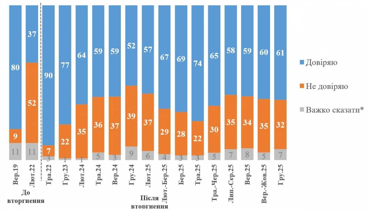 Уровень доверия президент Зеленскому составляет 61%, а не доверяют 32%. Стоит отметить, что показатели доверия к президенту остаются динамичными: в конце ноября, после коррупционного скандала, доверие Зеленскому выражали 49% респондентов, тогда как в начале декабря оно выросло до 63%, а 8-13 декабря составляло 65%.