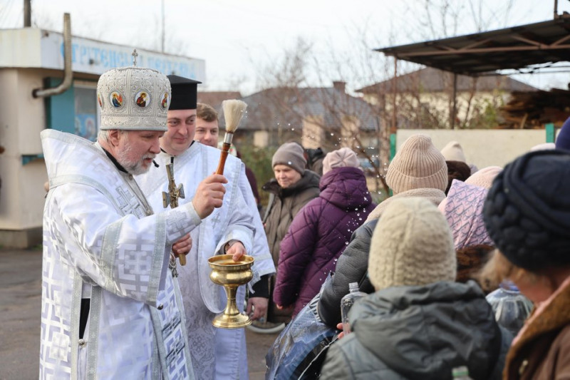 На вулиці єпископ Херсонський та Таврійський Нікодим окропив людей та освятив воду, яку вони принесли з собою, 6 січня 2026 року. Суспільне Херсон/Олександр Корняков