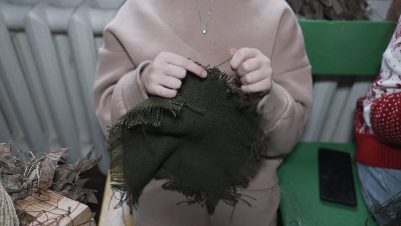 "Волонтери, з якими ми працюємо, передають ці сітки нашим захисникам, а вони приносять нам матеріали, які закуповують за власний кошт. Відповідно до пори року: білого, зеленого кольору. І відповідно до пори року ми плетемо такого кольору кікімори та нашоломники", — розповіла Олена Катеринич.